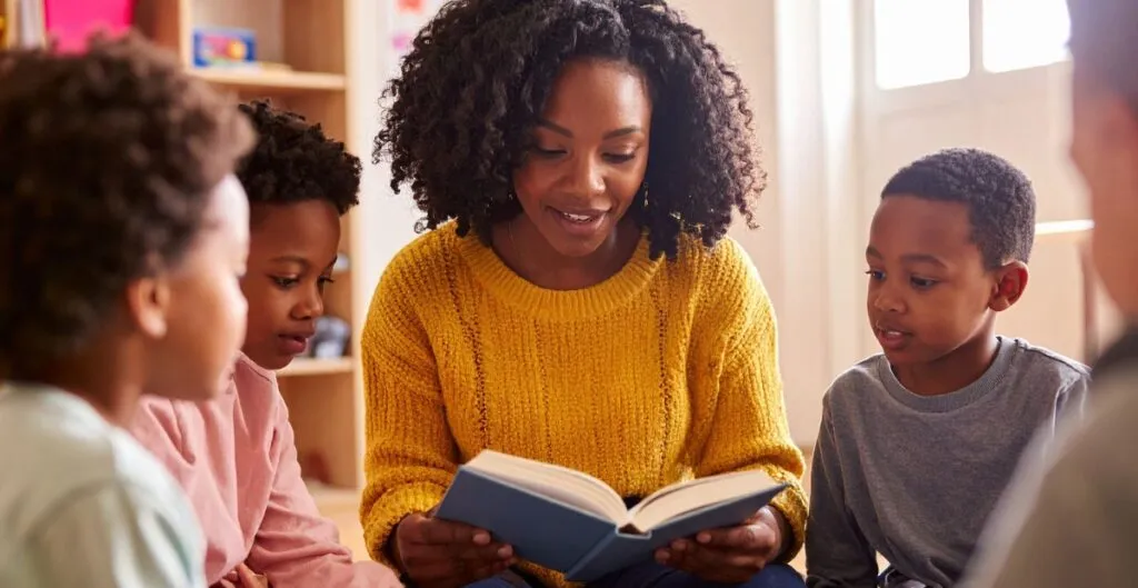 A contação de histórias estimula a imaginação e ajuda no desenvolvimento da linguagem.
