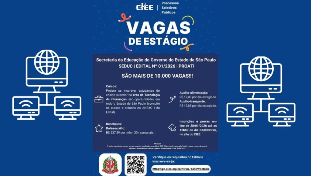 Foi publicado edital para PROATI ( Programa de Apoio à Tecnologia da Informação) em 2026. A Partir desse ano o PROATI poderá ser estagiários do ensino superior dos cursos de Engenharia da Computação, Ciência da Computação, Engenharia de Sistemas, Engenharia de Software, Análise e Desenvolvimento de Sistemas, Sistemas da Informação, Tecnologia em Redes de Computadores e Tecnologia da Informação.